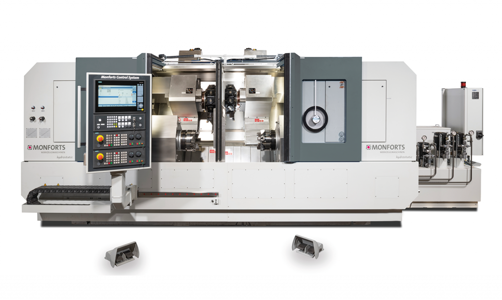 Die Monforts DNC 500 DuoTurn mit zwei Werkzeugrevolvern und zwei Spindeln ist eine erfolgreiche Integration von zwei Hochleistungsdrehmaschinen in ein einziges kompaktes Maschinenkonzept: Die rechte und linke Seite des Werkstücks werden gedreht, gebohrt oder gefräst, ohne Eingriff des Bedieners.